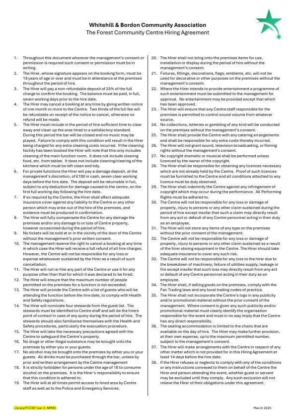 - There is a discretionary minimum hiring charge of £11.00 per daytime booking and £16.00 per evening booking to cover administration costs.
